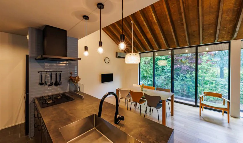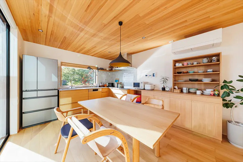 また、勾配天井を活かしたリビングでは、屋根形状をそのまま感じられるような伸びやかな空間がつくれます。木の梁や天井の表情を見せることで、山小屋のような温かみや、自然素材の魅力も感じやすくなります。さらに、スキップフロアを使ってワークスペースやスタディコーナーを設ければ、家族が同じ空間にいながら、それぞれ違うことをして過ごせる“緩やかなつながり”が生まれます。